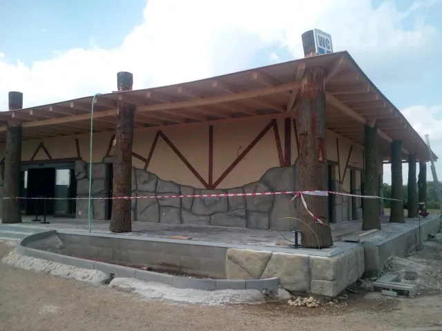 Stavba se zelenou střechou a prvky z přírodních materiálů harmonicky zapadá do okolí zábavního parku.