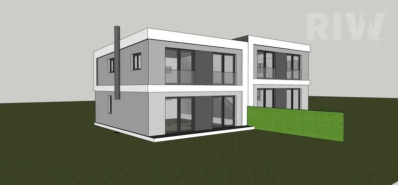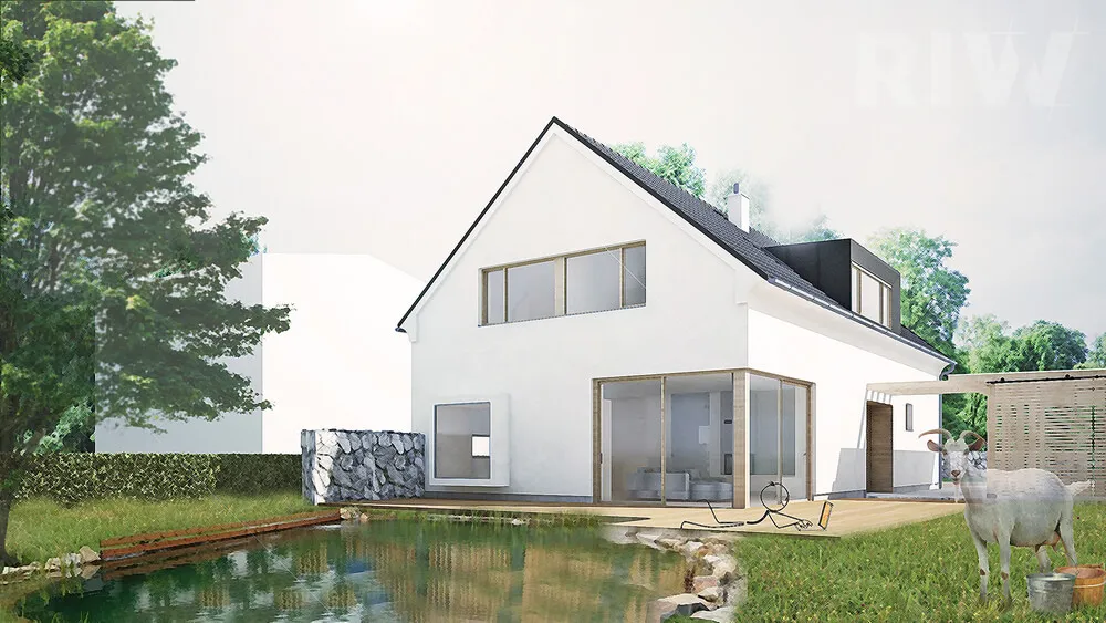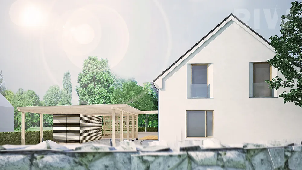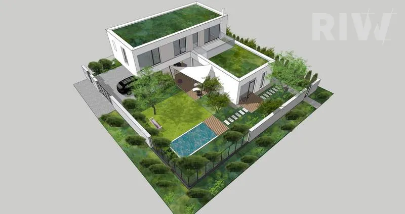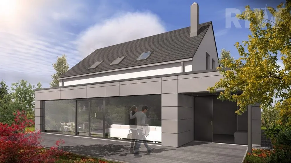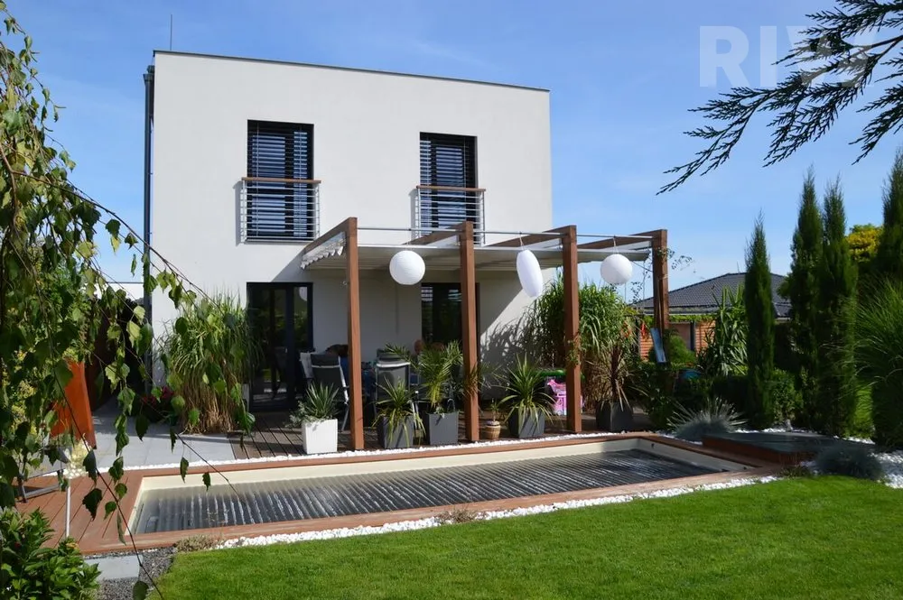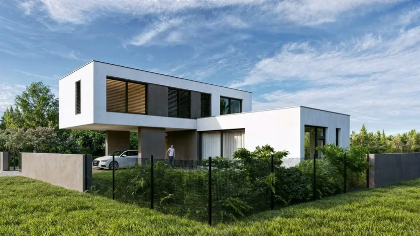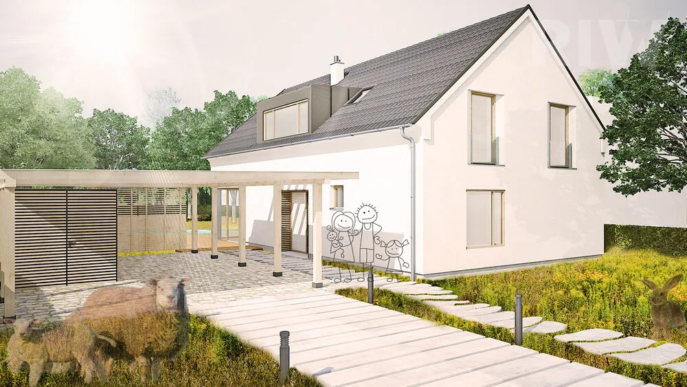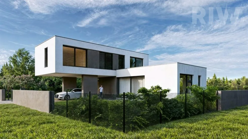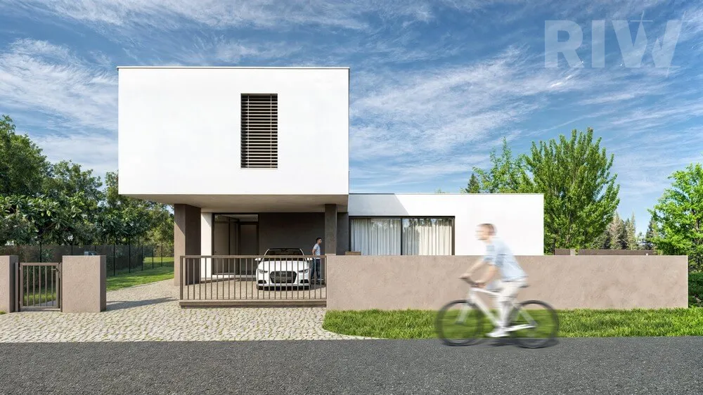 Dvoupodlažní dům s plochou střechou obdélníkového tvaru, velkou terasou, která nabízí atraktivní místo na slunci i ve stínu propojená se zahradou a bazénem. K domu vcházíme přístřeškem dvougaráže se zelenou střechou. Dispoziční řešení tohoto domu je efektivní a zároveň velkorysé. V přízemí se nachází prostorný obývací pokoj, jídelní a kuchyňský kout, technická místnost se sprchovým koutem a WC. Schodiště se diskrétně uhnízdilo do středu domu, takže v horním patře je dostatek místa pro tři pokoje se vstupem na balkón, koupelnu s vanou a samostatným WC. Hlavní ložnice je obzvláště příjemná díky velké šatně. Dům má směrem do ulice velká okna, kterým se majitelé mohou nerušeně kochat výhledem.