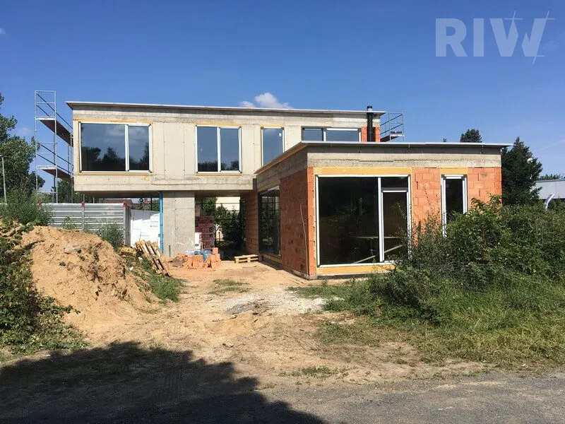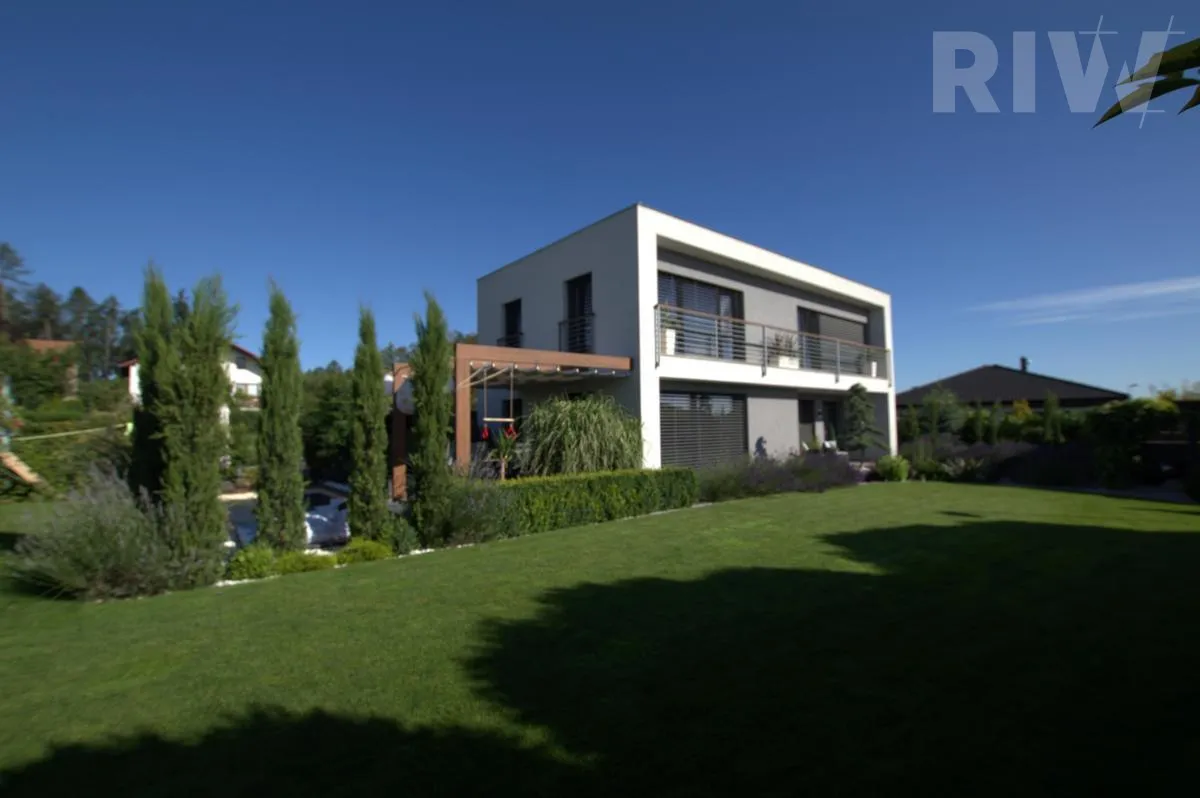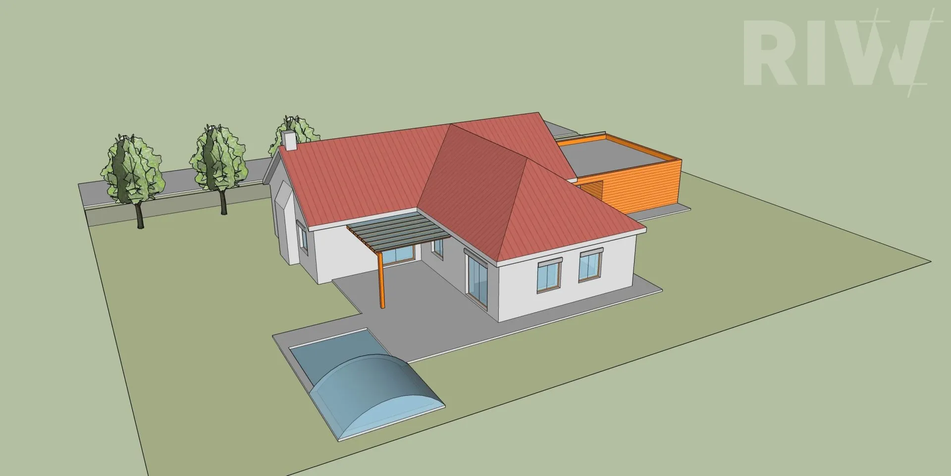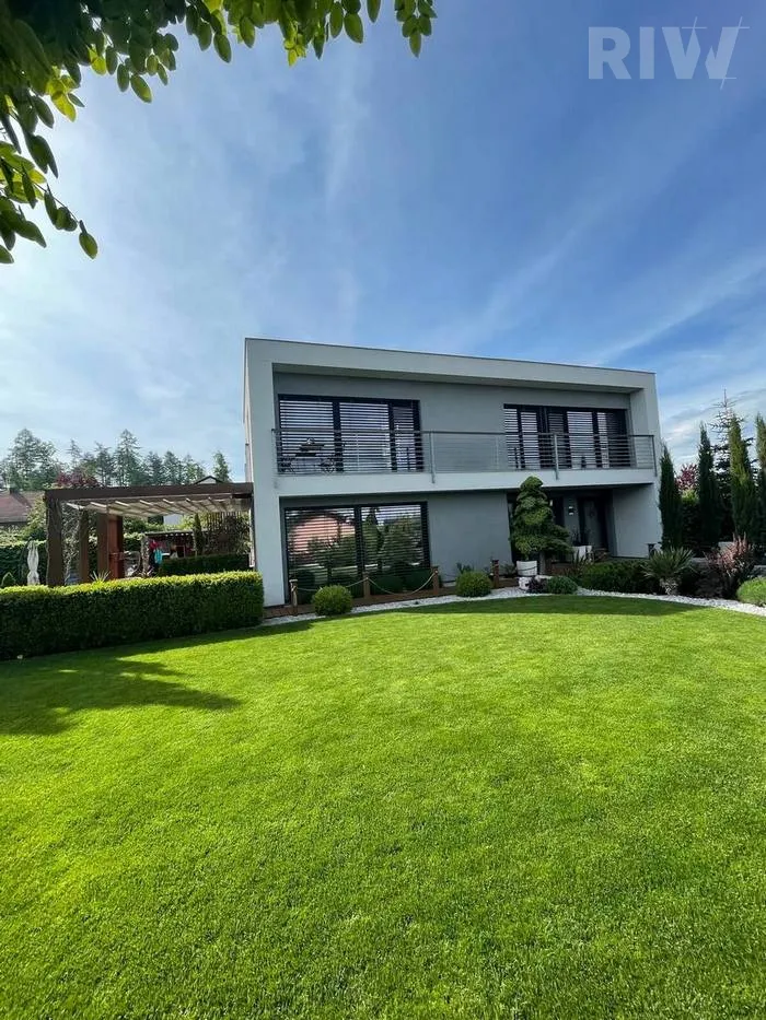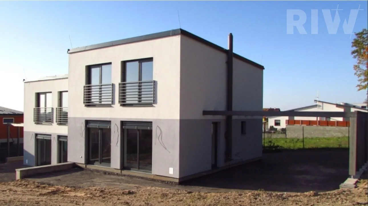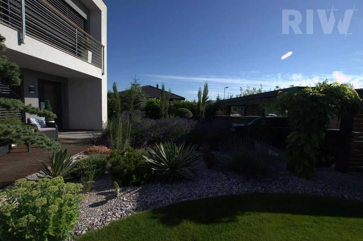 Dvoupodlažní dům s plochou střechou obdélníkového tvaru, velkou terasou, která nabízí atraktivní místo na slunci i ve stínu propojená se zahradou a bazénem. K domu vcházíme přístřeškem dvougaráže se zelenou střechou. Dispoziční řešení tohoto domu je efektivní a zároveň velkorysé. V přízemí se nachází prostorný obývací pokoj, jídelní a kuchyňský kout, technická místnost se sprchovým koutem a WC. Schodiště se diskrétně uhnízdilo do středu domu, takže v horním patře je dostatek místa pro tři pokoje se vstupem na balkón, koupelnu s vanou a samostatným WC. Hlavní ložnice je obzvláště příjemná díky velké šatně. Dům má směrem do ulice velká okna, kterým se majitelé mohou nerušeně kochat výhledem.