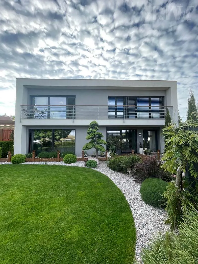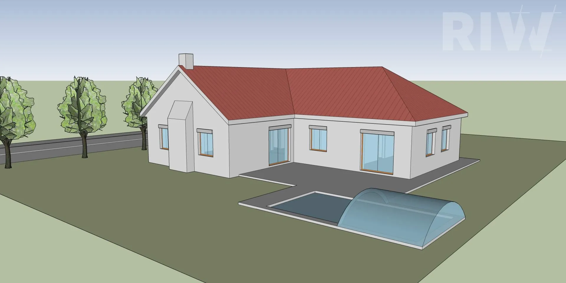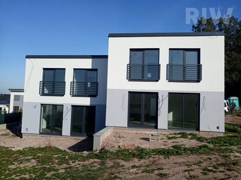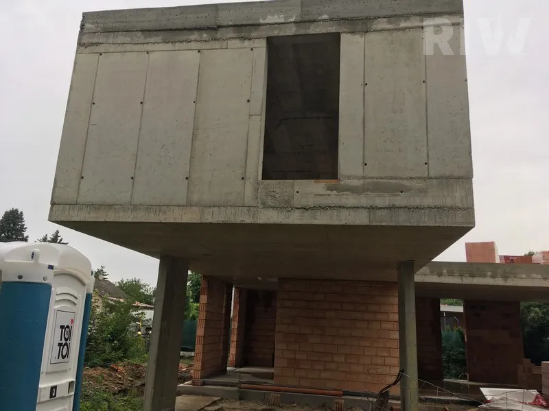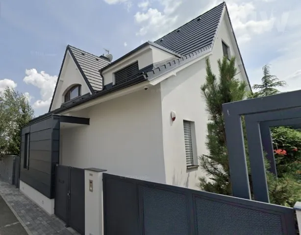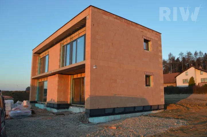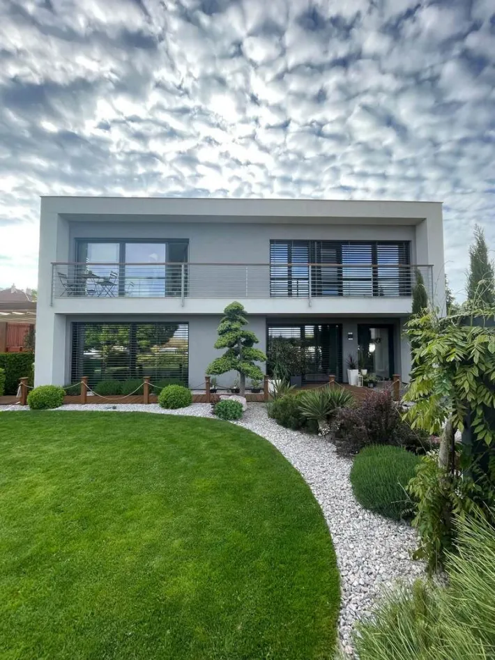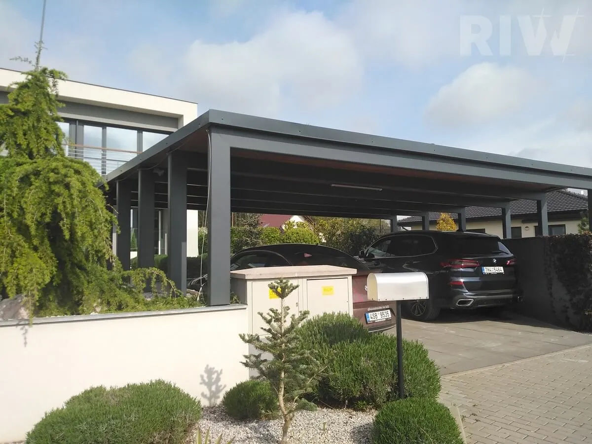Dvoupodlažní dům s plochou střechou obdélníkového tvaru, velkou terasou, která nabízí atraktivní místo na slunci i ve stínu propojená se zahradou a bazénem. K domu vcházíme přístřeškem dvougaráže se zelenou střechou. Dispoziční řešení tohoto domu je efektivní a zároveň velkorysé. V přízemí se nachází prostorný obývací pokoj, jídelní a kuchyňský kout, technická místnost se sprchovým koutem a WC. Schodiště se diskrétně uhnízdilo do středu domu, takže v horním patře je dostatek místa pro tři pokoje se vstupem na balkón, koupelnu s vanou a samostatným WC. Hlavní ložnice je obzvláště příjemná díky velké šatně. Dům má směrem do ulice velká okna, kterým se majitelé mohou nerušeně kochat výhledem.