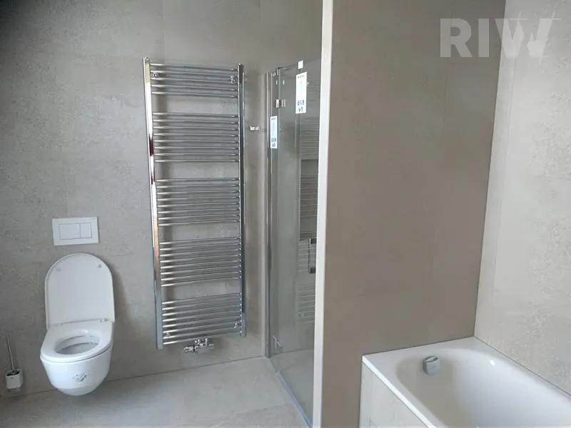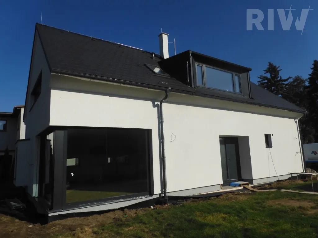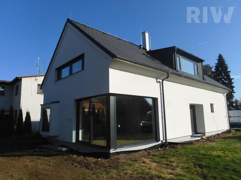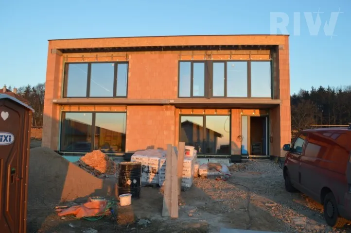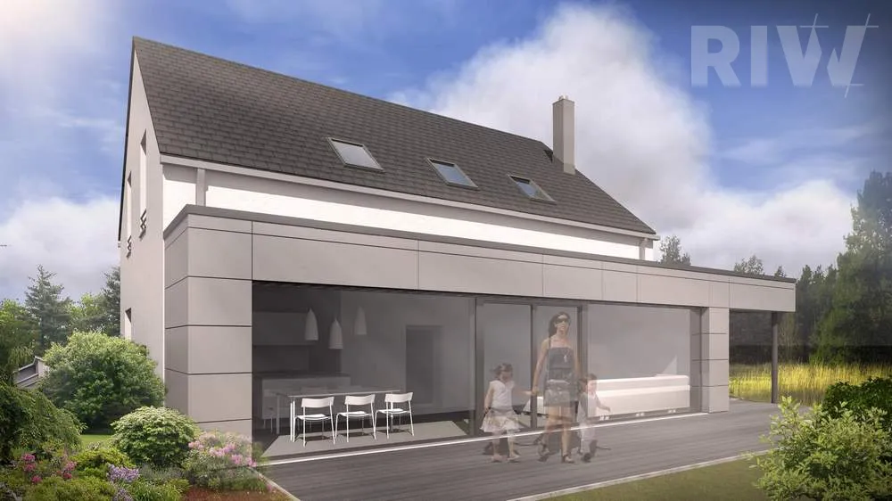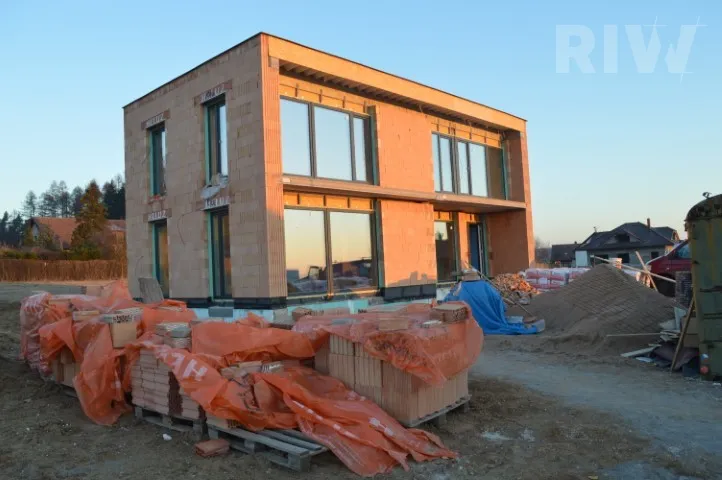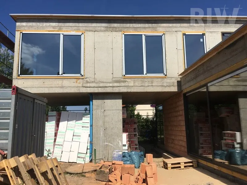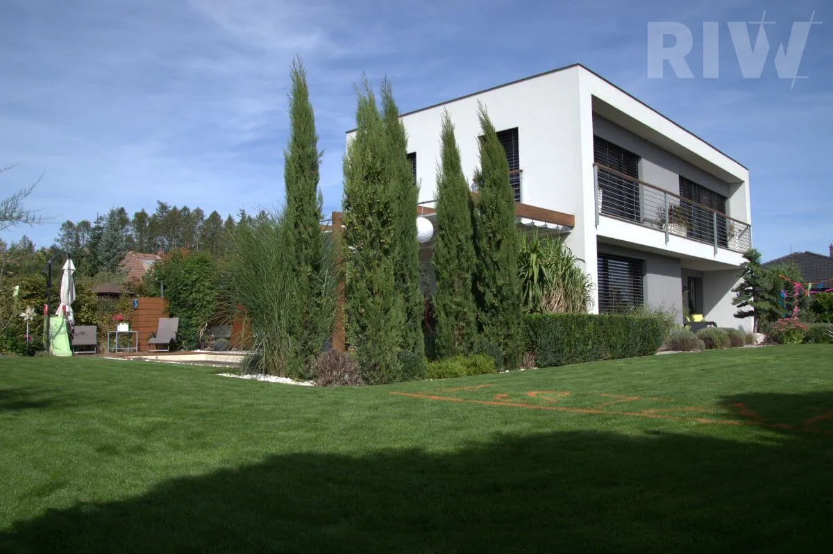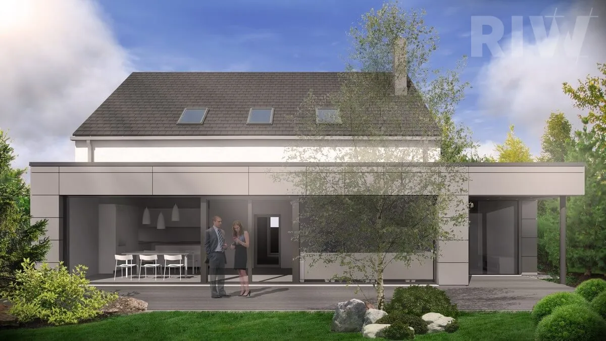 Dvoupodlažní dům s plochou střechou obdélníkového tvaru, velkou terasou, která nabízí atraktivní místo na slunci i ve stínu propojená se zahradou a bazénem. K domu vcházíme přístřeškem dvougaráže se zelenou střechou. Dispoziční řešení tohoto domu je efektivní a zároveň velkorysé. V přízemí se nachází prostorný obývací pokoj, jídelní a kuchyňský kout, technická místnost se sprchovým koutem a WC. Schodiště se diskrétně uhnízdilo do středu domu, takže v horním patře je dostatek místa pro tři pokoje se vstupem na balkón, koupelnu s vanou a samostatným WC. Hlavní ložnice je obzvláště příjemná díky velké šatně. Dům má směrem do ulice velká okna, kterým se majitelé mohou nerušeně kochat výhledem.