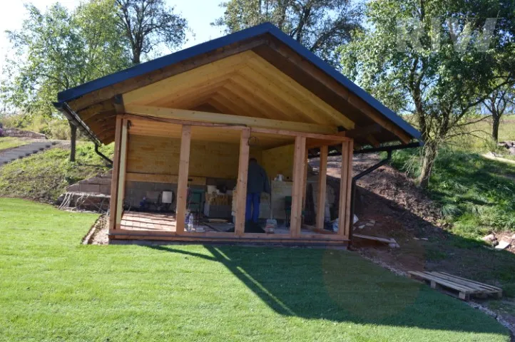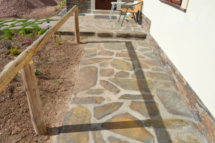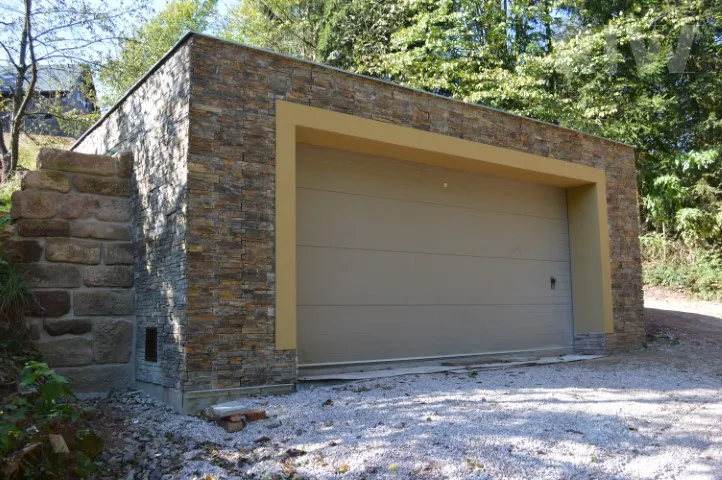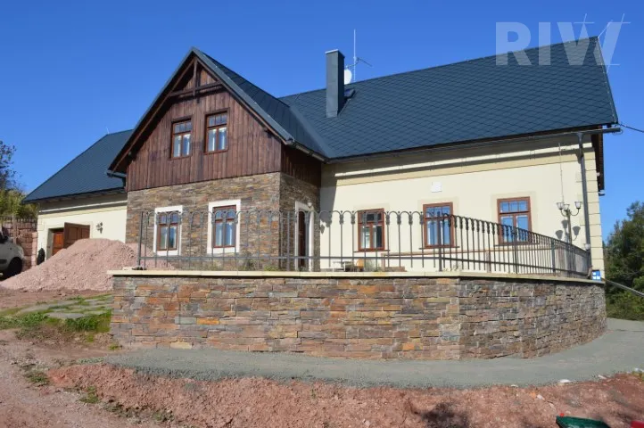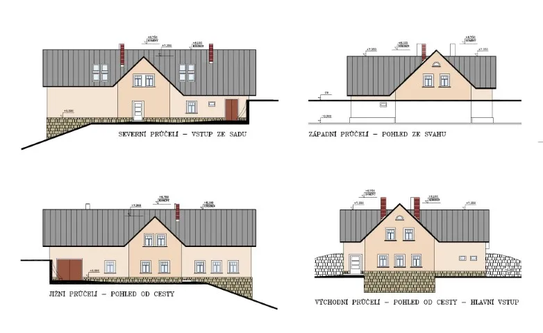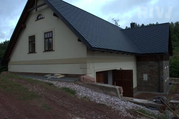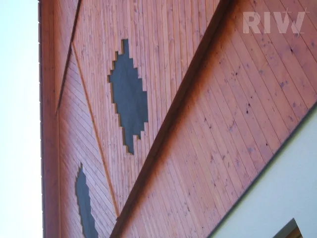 Fasáda: štít – dřevěný obklad a kamenný obklad z přírodního křemence v přírodních hnědých, béžových a červených odstínech, omítka světlé přírodní barvy