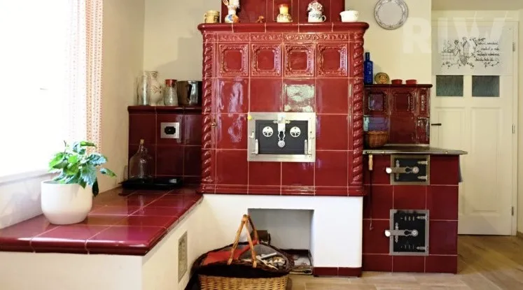 Srdce domova majitelů tvoří centrální obytná místnost s klenutým stropem z původních cihel zasazených do ocelových traverz. Ale hlavním klenotem této místnosti jsou červená kachlová kamna. Ty jsou prostě dech beroucí.
